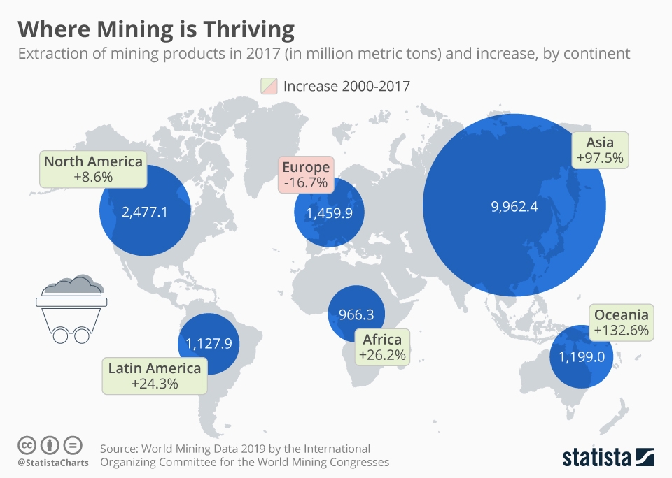 Abbildung 5: Europa ist der einzige Kontinent, in dem der Bergbau im 21. Jahrhundert zurückgegangen ist – trotz weltweit steigender Nachfrage. In Asien und Ozeanien hat sich der Bergbau zwischen 2000 und 2017 fast verdoppelt bzw. mehr als verdoppelt.[Quelle: Statista].