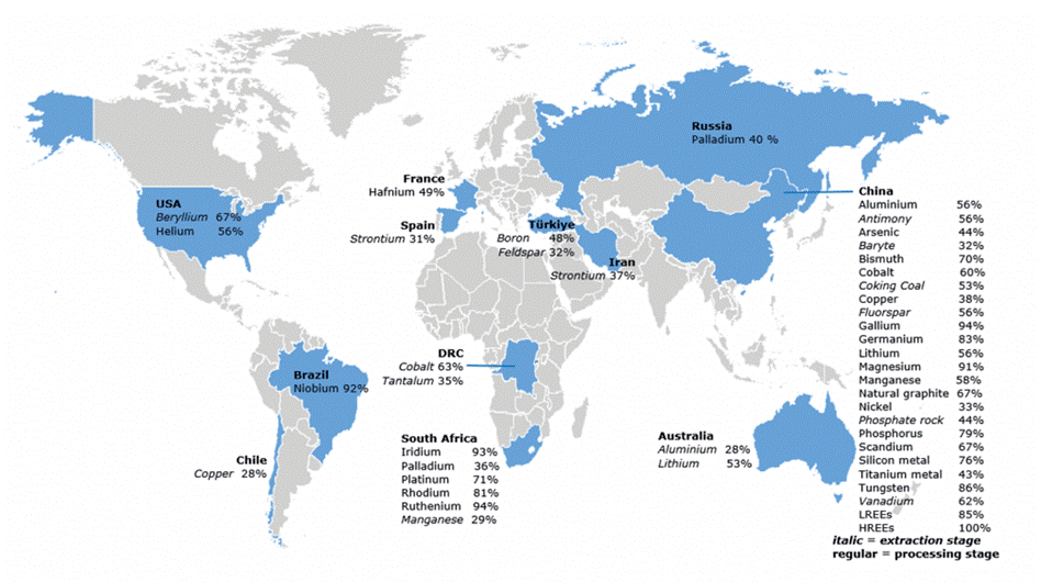 Abbildung 3: Länder mit dem größten Anteil an der weltweiten Produktion kritischer und strategischer Rohstoffe (CSRM)[Quelle: European Commission]. Hinweis: Diese Karte betrachtet nur entweder die Förder- oder die Verarbeitungsstufe und berücksichtigt nicht die Nationalität der produzierenden Unternehmen.